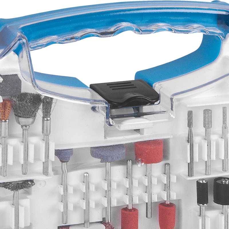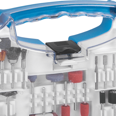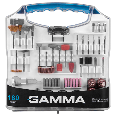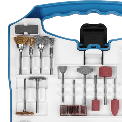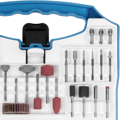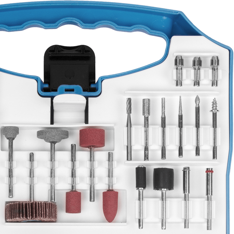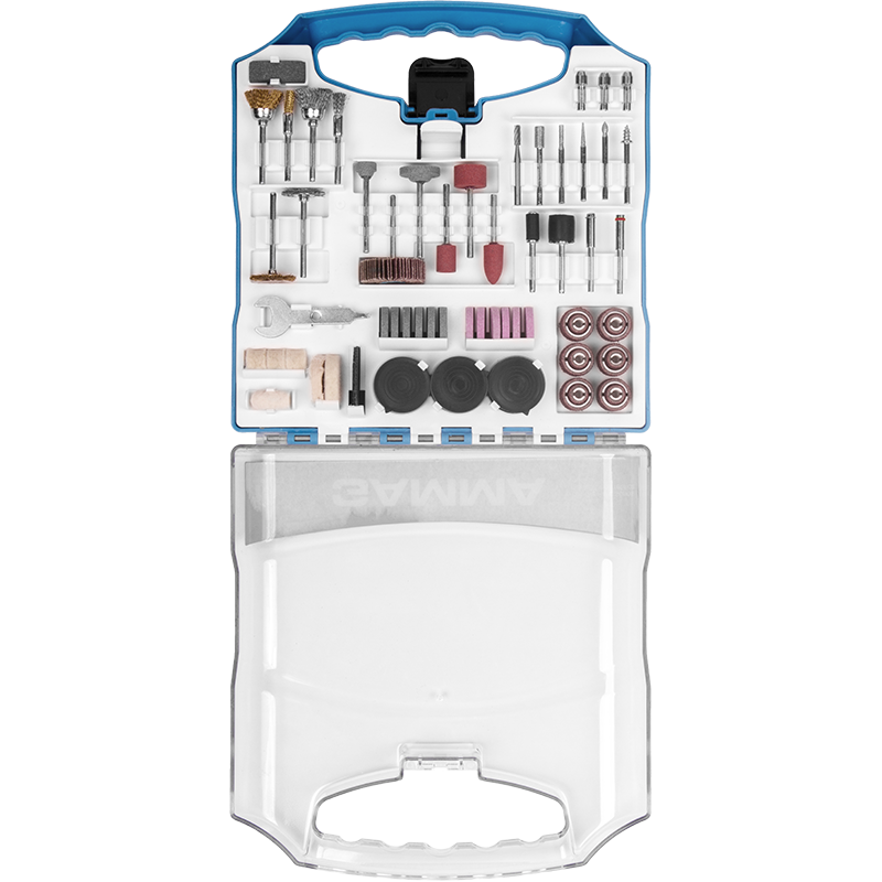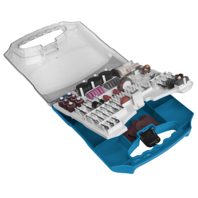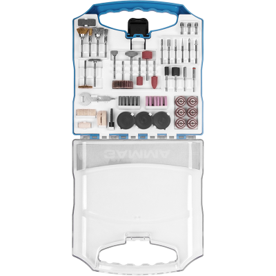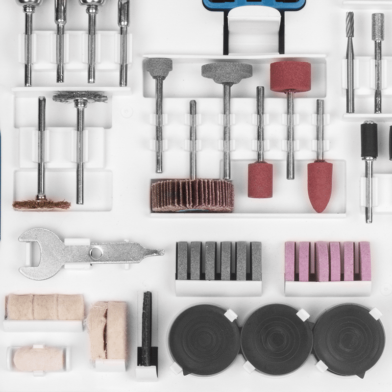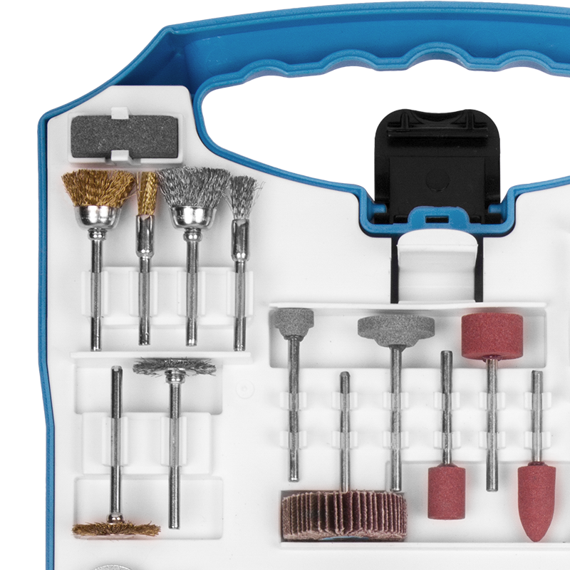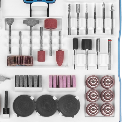 12 Lixas cilíndricas de 12,7mm, 1 Roda de pano, 4 Rodas de feltro, 1 Haste para discos de feltro, 2 Suportes para lixa cilíndrica, 4 Limas rotativas diamantadas, 1 Fresa de aço rápido (HSS), 3 Pontas montadas de óxido de alumínio, 6 Abrasivos de óxido de alumínio, 2 Pontas montadas de carbeto de silício, 6 Abrasivos de carbeto de silício, 6 Escovas, 1 Pasta para polimento, 75 Discos de corte, 45 Discos de lixa, 3 Pinças, 1 Suporte para disco de corte, 2 Discos de corte de fibra de vidro, 1 Disco de lixa flap, 1 Chave fixa, 1 Bastão abrasivo de carbeto de silício, 1 Suporte para disco de lixa e 1 Ponta de feltro para polimento.